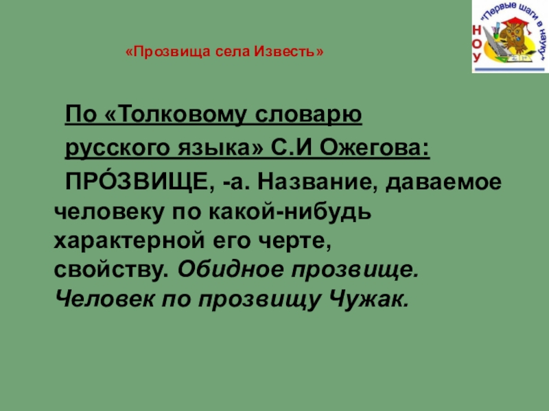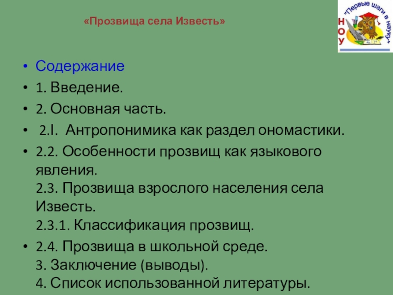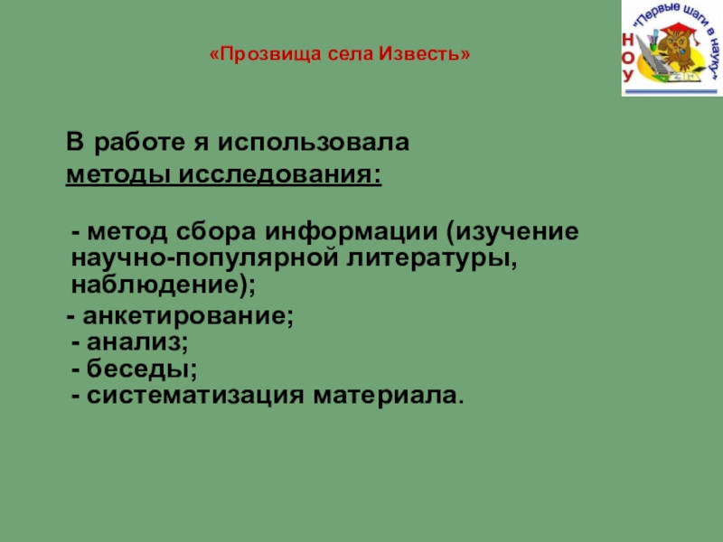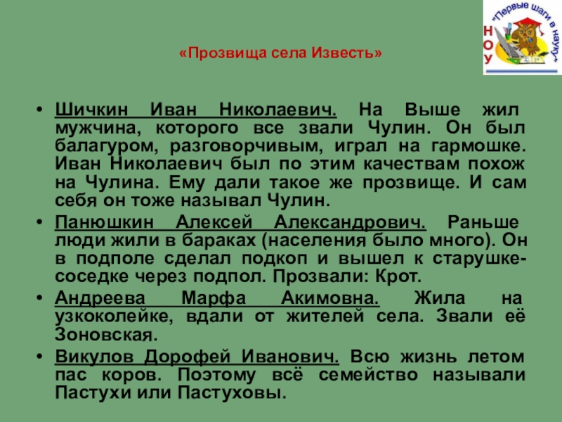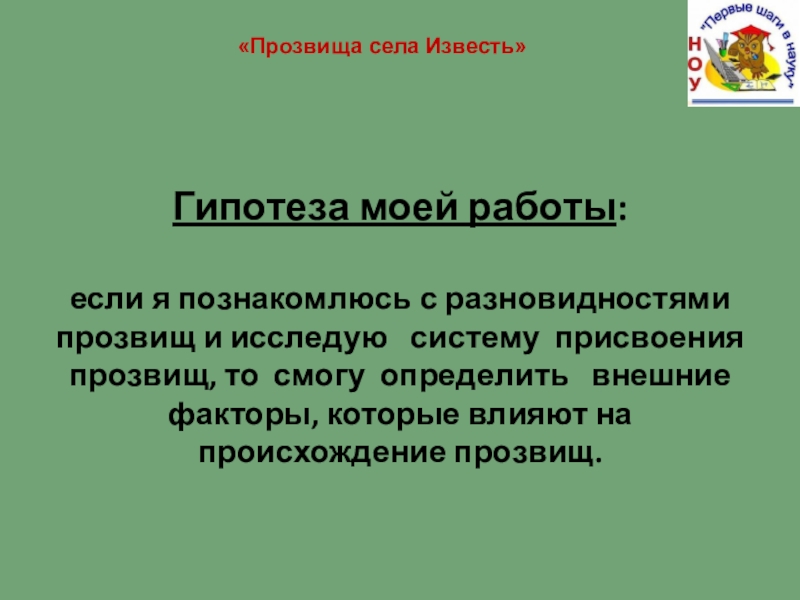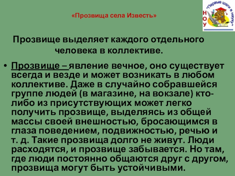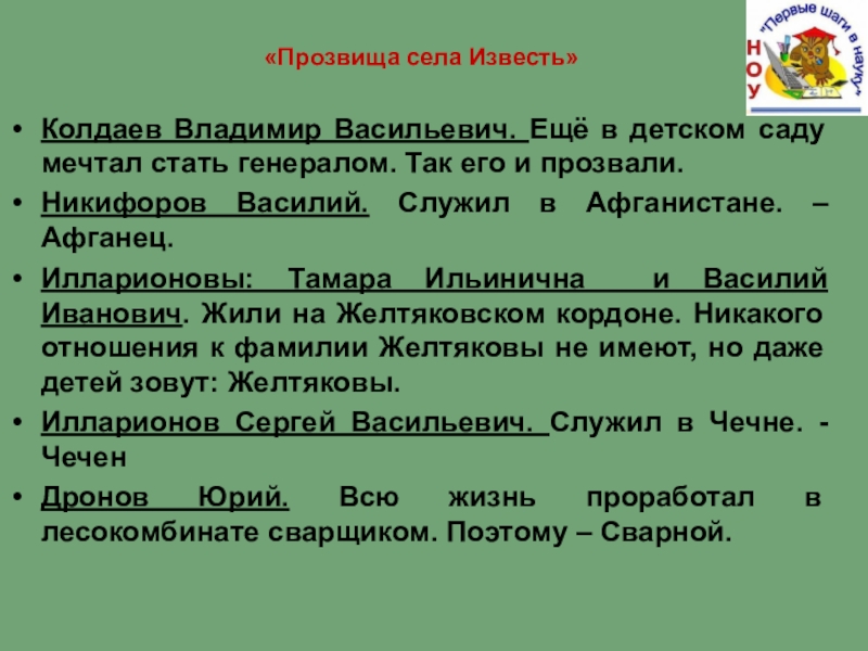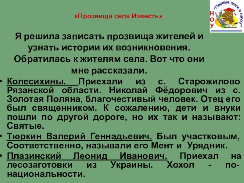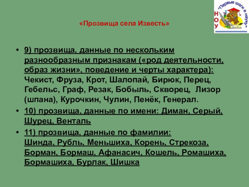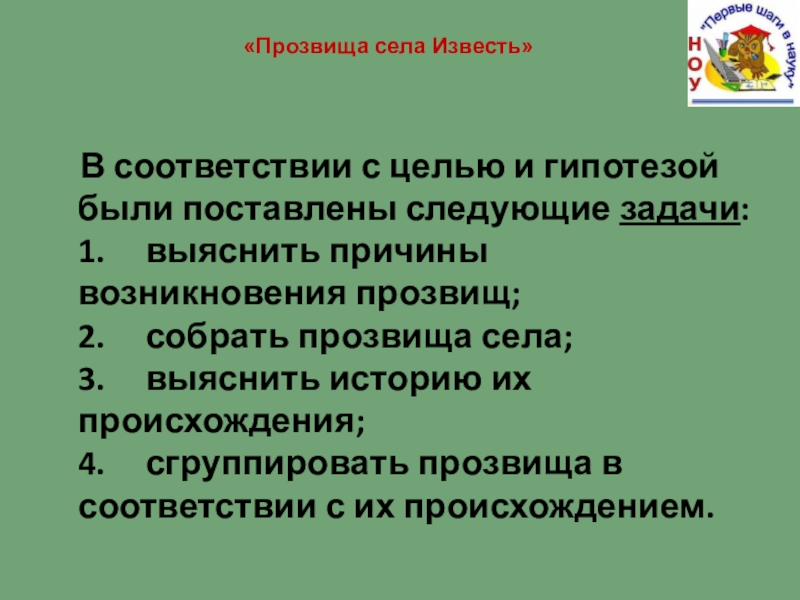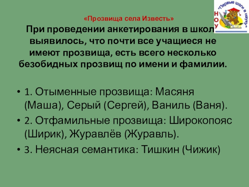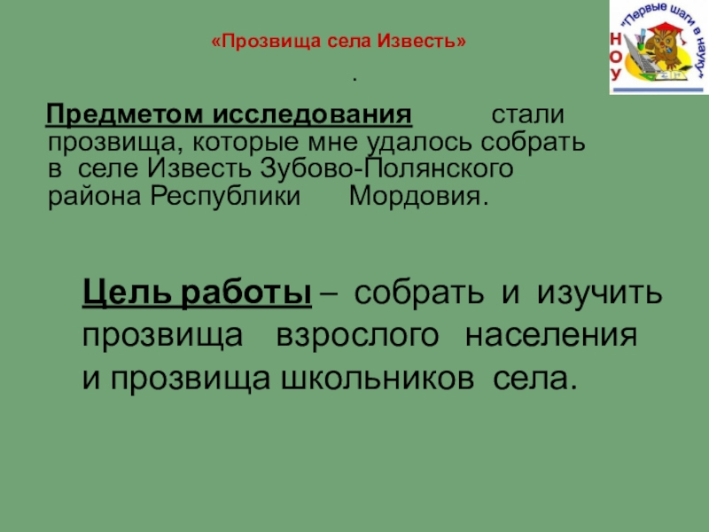 Цель работы – собрать и изучить прозвища взрослого населения и прозвища школьников села.