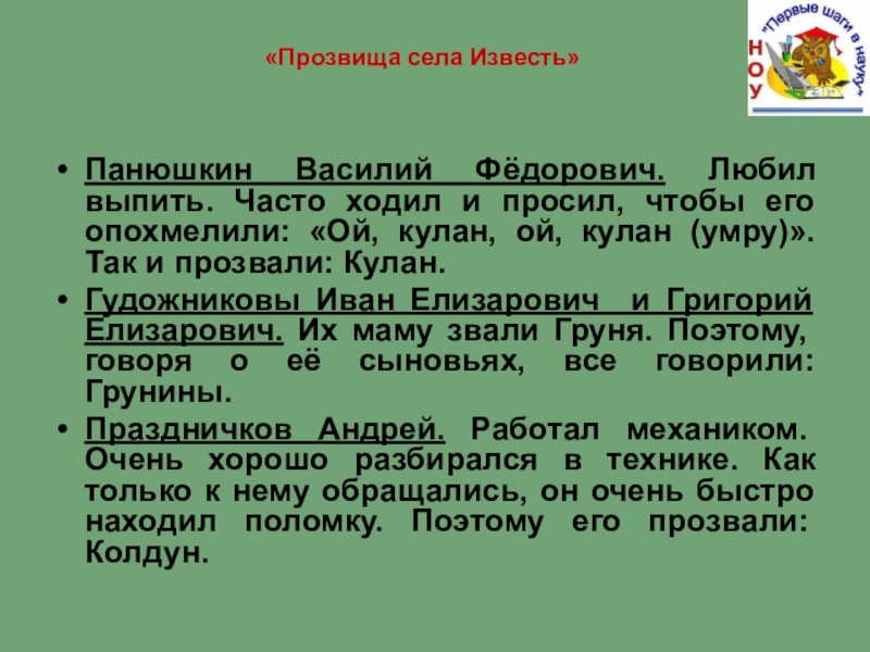 1) прозвища, произошедшие от имени родственников: Желтяковы, Казаки, Васейчик, Грунины. Васей, Мергушки, Святые.