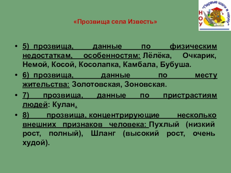 4) прозвища, данные по внешности: Большак, Курноска, Топтун, Профессор, Лысый, Седой, Рыжая, Длинный, Пузырь, Итальянец, Рыжий, Беззубый, Морозко, Чёрная Марька, Будулай.