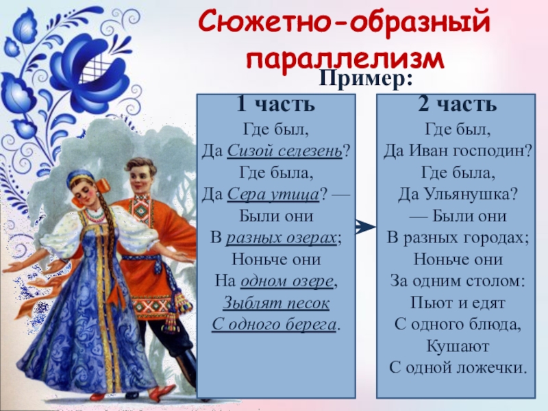 Сюжетно-образный параллелизм- первая параллель символическая, а вторая — реальная.