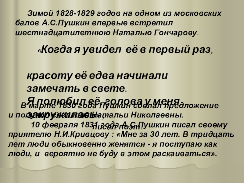 10 февраля 1831 года А.С.Пушкин писал своему приятелю Н.И.Кривцову : «Мне за 30 лет. В тридцать лет люди обыкновенно женятся - я поступаю как