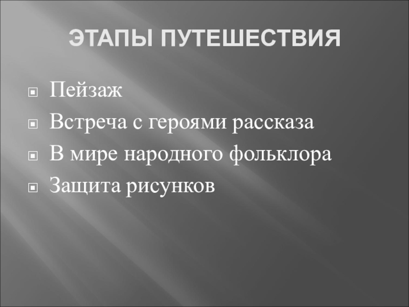 ЭТАПЫ ПУТЕШЕСТВИЯПейзажВстреча с героями рассказаВ мире народного фольклораЗащита рисунков