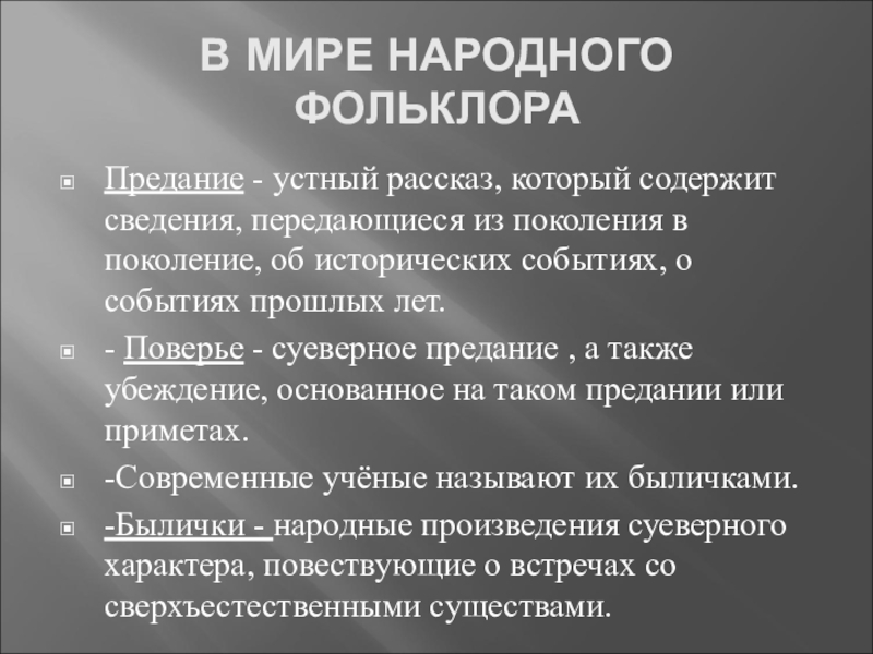 В МИРЕ НАРОДНОГО ФОЛЬКЛОРАПредание - устный рассказ, который содержит сведения, передающиеся из поколения в поколение, об исторических