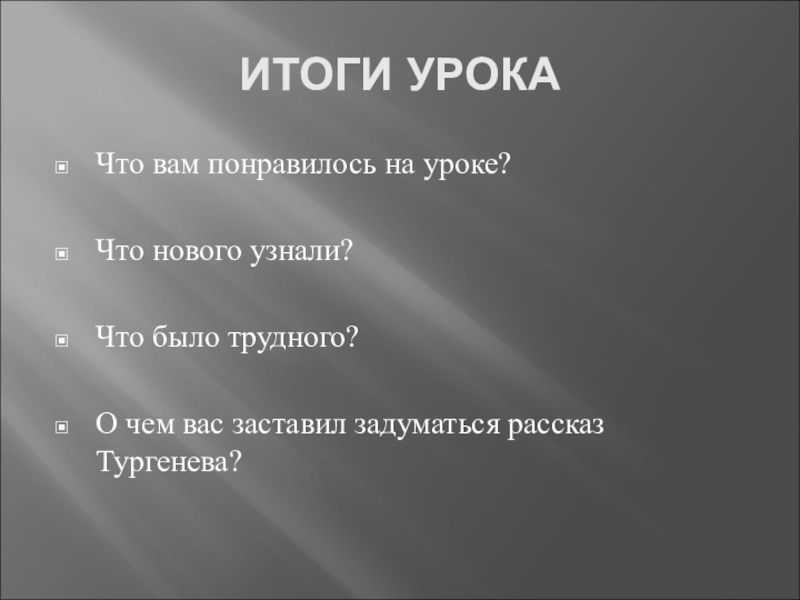 ИТОГИ УРОКАЧто вам понравилось на уроке?Что нового узнали?Что было трудного?О чем вас заставил задуматься рассказ Тургенева?