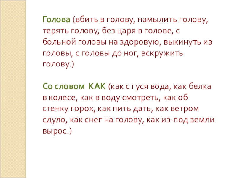 Слайд 15Голова (вбить в голову, намылить голову, терять голову, без царя в