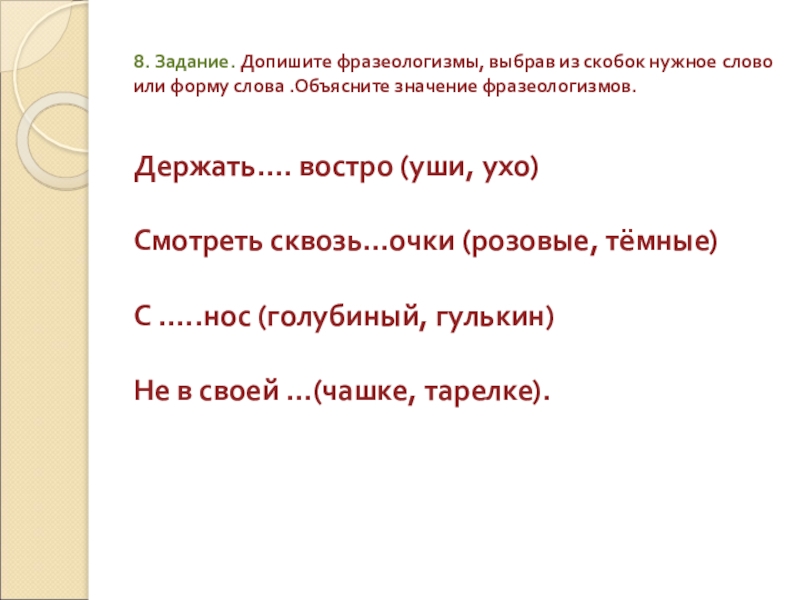 Слайд 128. Задание. Допишите фразеологизмы, выбрав из скобок нужное слово или форму