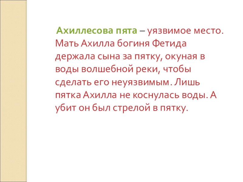 Слайд 17 Ахиллесова пята – уязвимое место. Мать Ахилла богиня Фетида держала