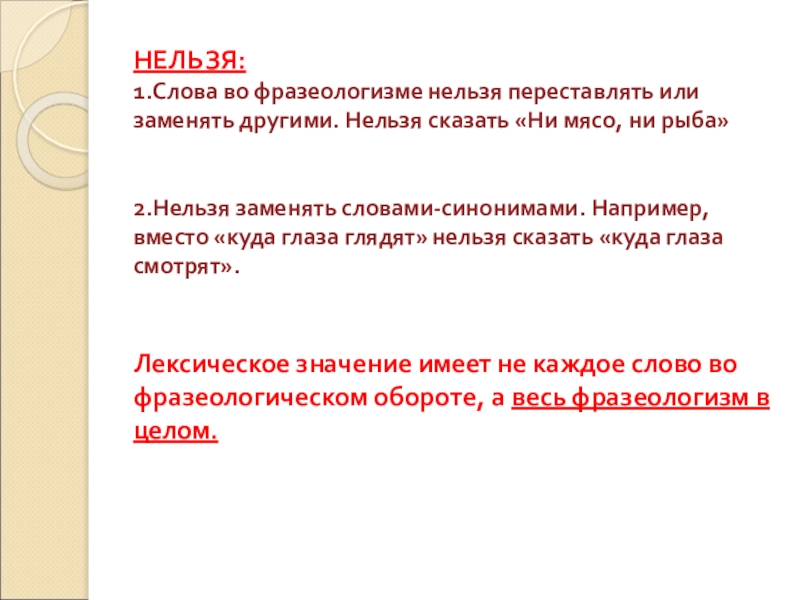 1.Слова во фразеологизме нельзя переставлять или заменять другими. Нельзя сказать «Ни