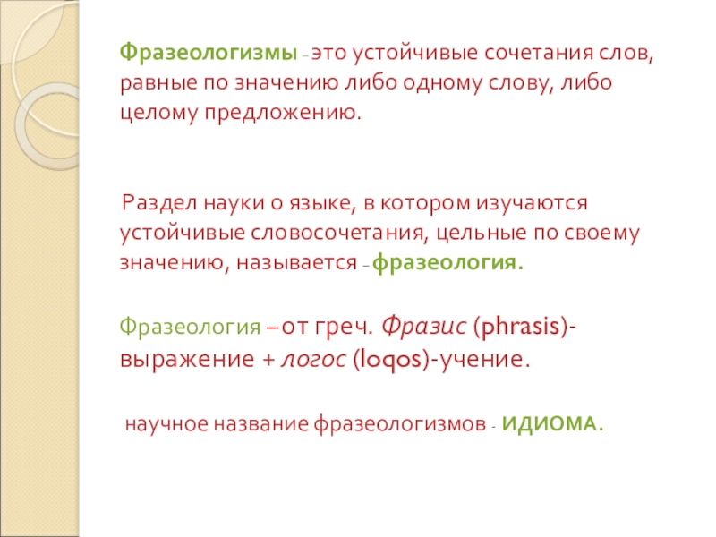 Фразеология – от греч. Фразис (phrasis)- выражение + логос (loqos)-учение.