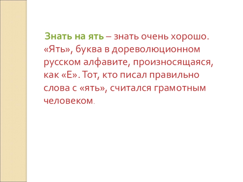 Слайд 18 Знать на ять – знать очень хорошо. «Ять», буква в