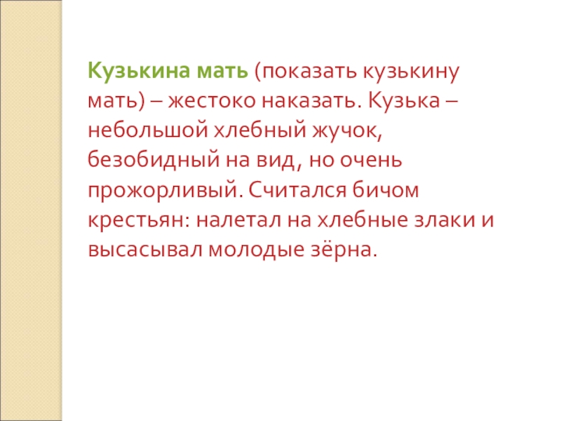 Слайд 19Кузькина мать (показать кузькину мать) – жестоко наказать. Кузька – небольшой