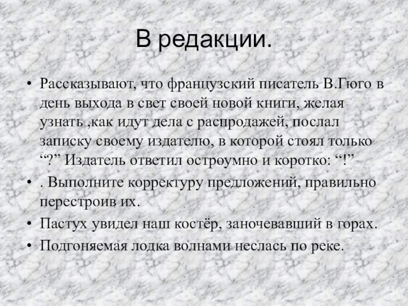 Рассказывают, что французский писатель В.Гюго в день выхода в свет