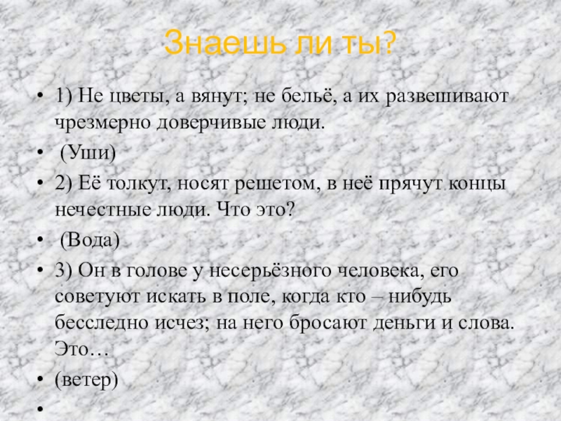 2) Её толкут, носят решетом, в неё прячут концы нечестные люди. Что это?