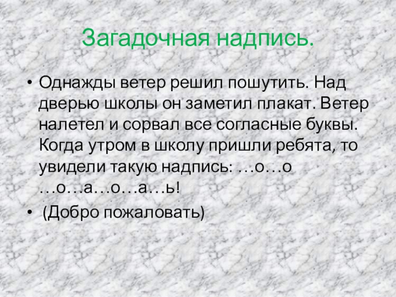 Ветер налетел и сорвал все согласные буквы. Когда утром в школу пришли ребята, то увидели такую надпись: …о…о …о…а…о…а…ь!