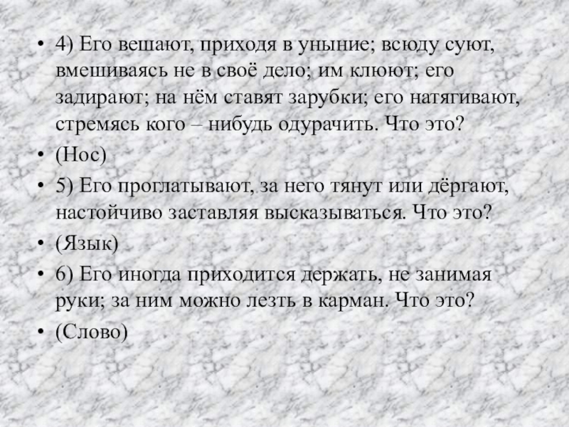 Слайд 34) Его вешают, приходя в уныние; всюду суют, вмешиваясь не в