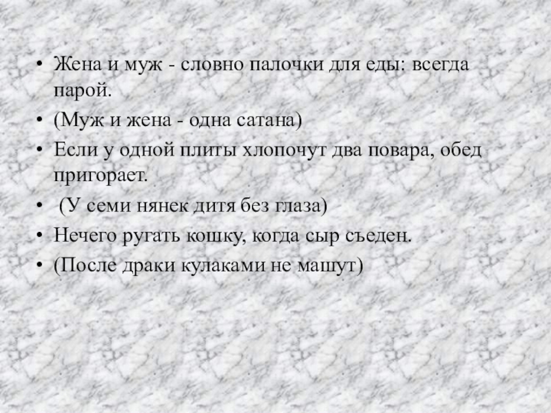 Слайд 12Жена и муж - словно палочки для еды: всегда парой.
