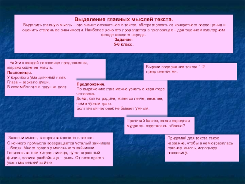 Выделить главную мысль – это значит осознать ее в тексте, абстрагировать от конкретного воплощения и оценить степень ее значимости. Наиболее ясно это проявляется в пословицах – драгоценном культурном фонде каждого народа.