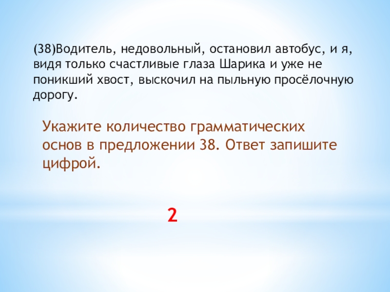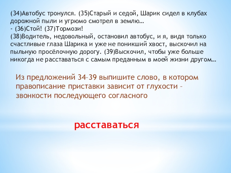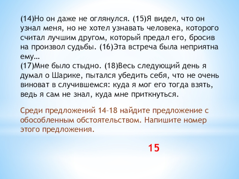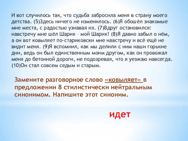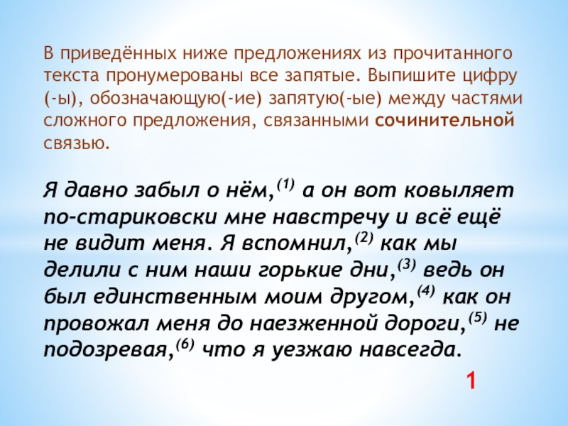 Я давно забыл о нём,(1) а он вот ковыляет по-стариковски мне навстречу и всё ещё не видит меня. Я вспомнил,(2) как мы делили с ним наши горькие дни,(3) ведь он был единственным моим другом,(4) как он провожал меня до наезженной дороги,(5) не подозревая,(6) что я уезжаю навсегда.
