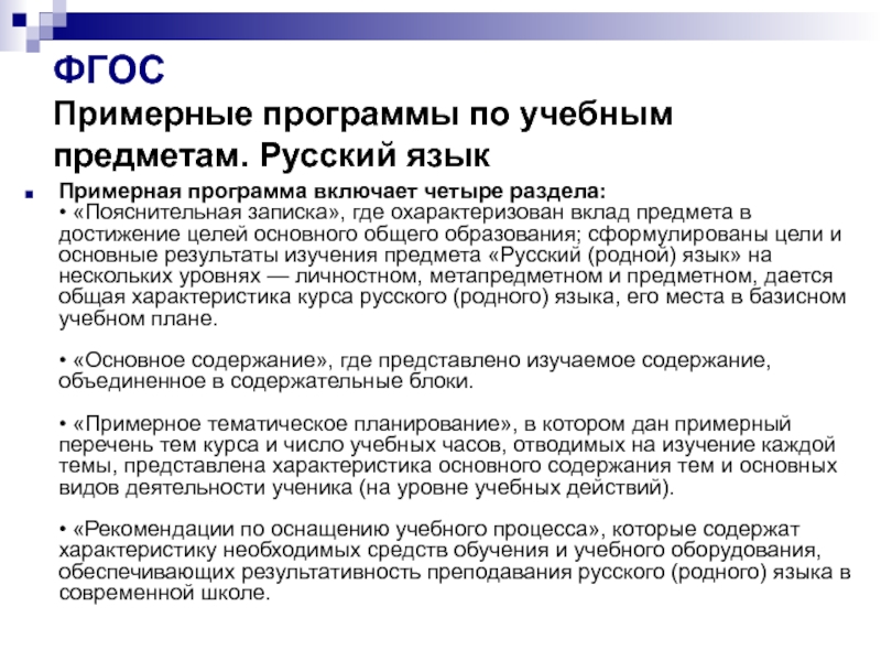 «Пояснительная записка», где охарактеризован вклад предмета в достижение целей основного общего образования; сформулированы цели и основные результаты изучения предмета «Русский (родной) язык» на нескольких уровнях — личностном, метапредметном и предметном, дается общая характеристика курса русского (родного) языка, его места в базисном учебном плане.