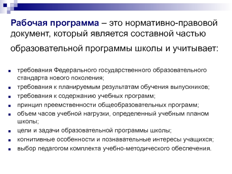 Слайд 2Рабочая программа – это нормативно-правовой документ, который является составной частью образовательной
