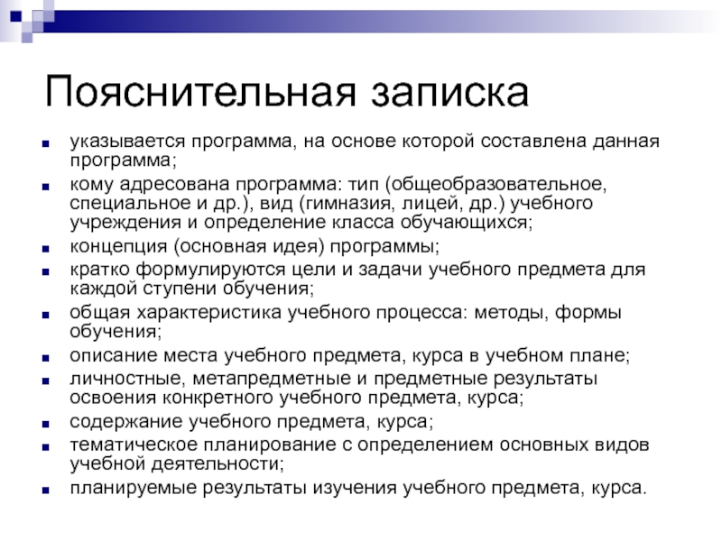 1) пояснительную записку, в которой конкретизируются общие цели основного общего образования с учётом специфики учебного предмета;