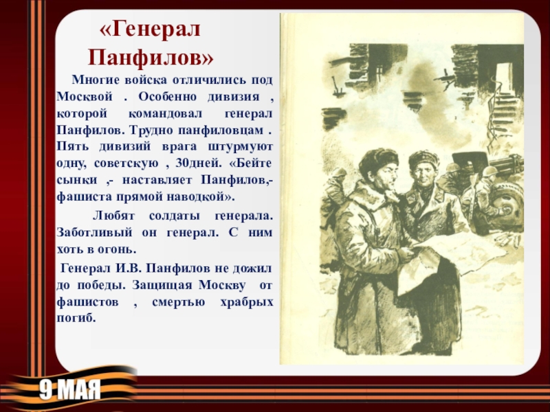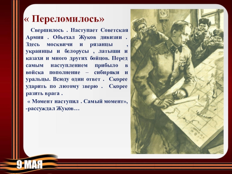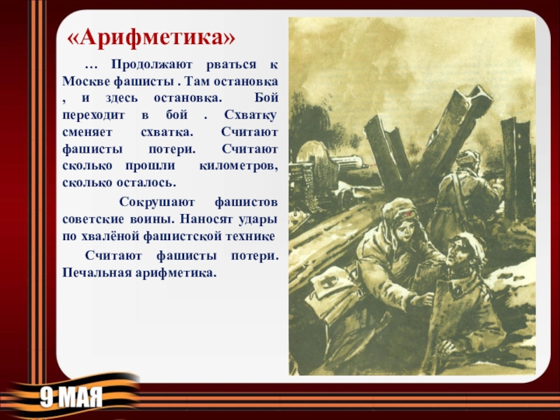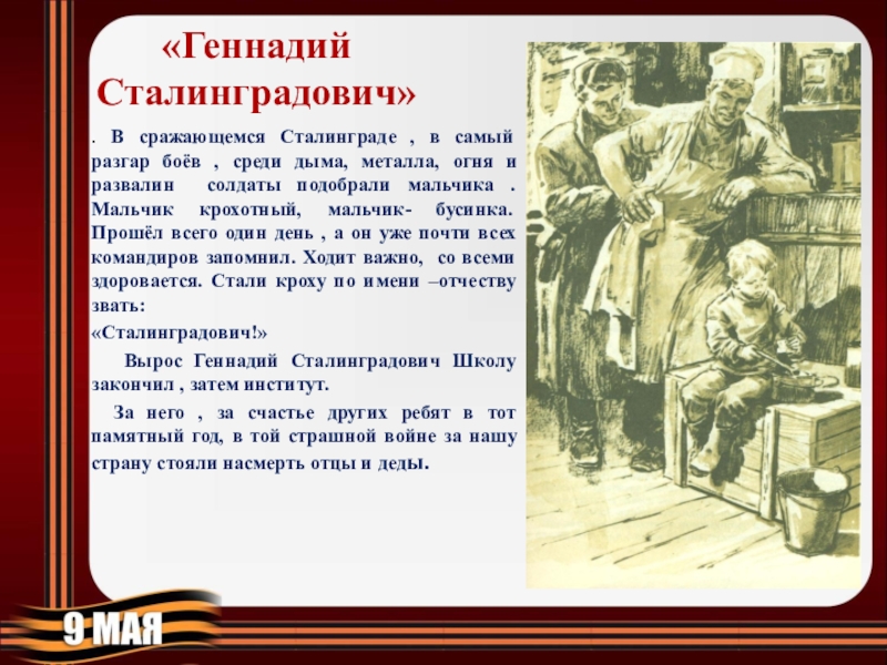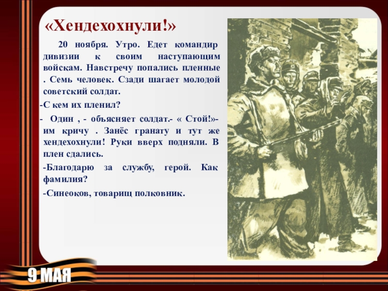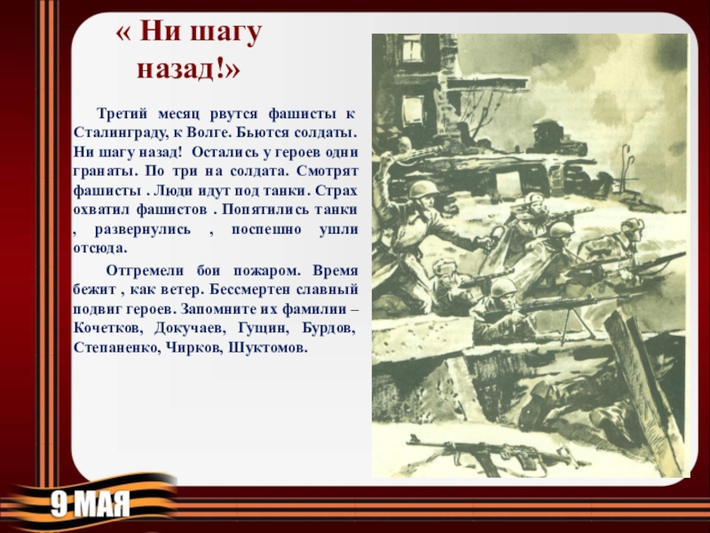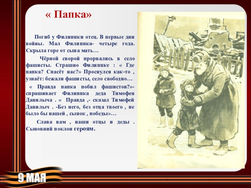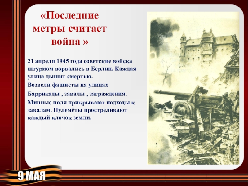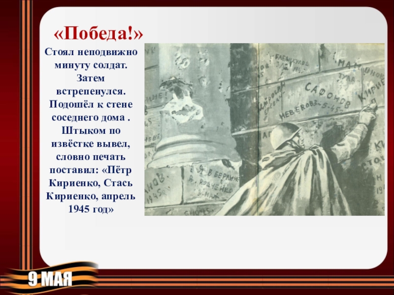 Стоял неподвижно минуту солдат. Затем встрепенулся. Подошёл к стене соседнего дома . Штыком по извёстке вывел, словно печать поставил: «Пётр Кириенко, Стась Кириенко, апрель 1945 год»