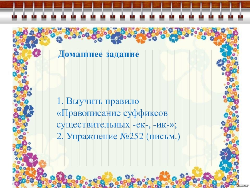 Домашнее задание  1. Выучить правило «Правописание суффиксов существительных -ек-, -ик-»; 2. Упражнение №252 (письм.)
