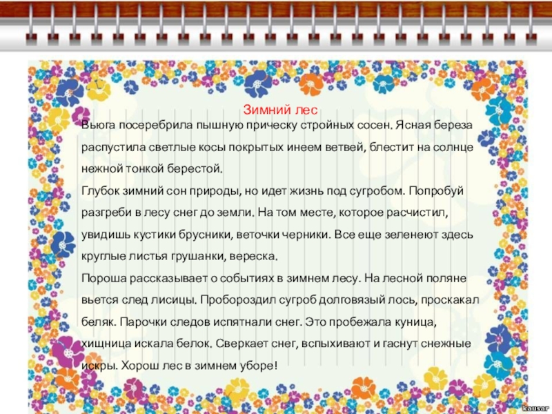 Зимний лесВьюга посеребрила пышную прическу стройных сосен. Ясная береза распустила светлые косы покрытых инеем ветвей, блестит на