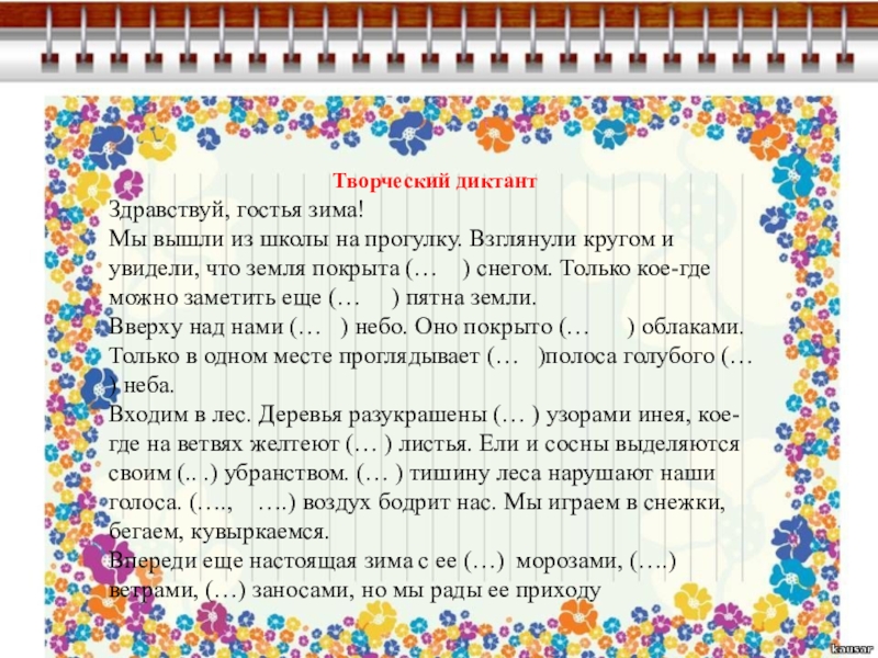 Творческий диктант Здравствуй, гостья зима!Мы вышли из школы на прогулку. Взглянули кругом и увидели, что земля покрыта