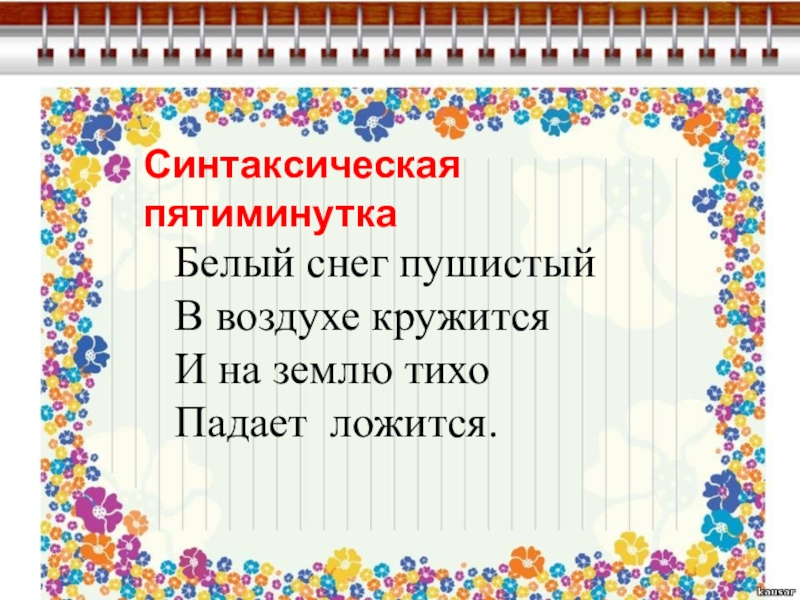Белый снег пушистый В воздухе кружится И на землю тихо Падает ложится.  Синтаксическая пятиминутка