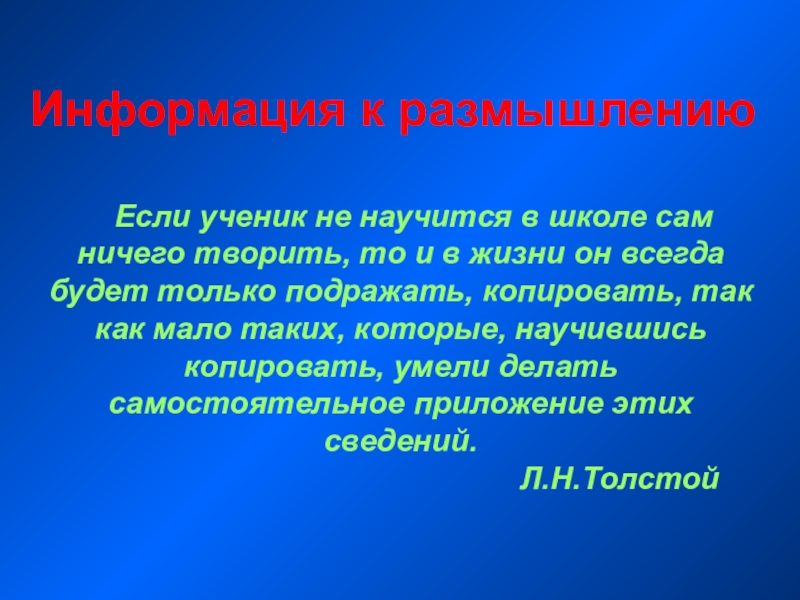 ничего творить, то и в жизни он всегда будет только подражать, копировать, так как мало таких, которые, научившись копировать, умели делать самостоятельное приложение этих сведений.