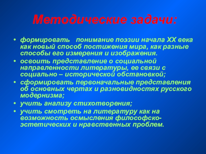 сформировать первоначальные представления об основных чертах и разновидностях русского модернизма;