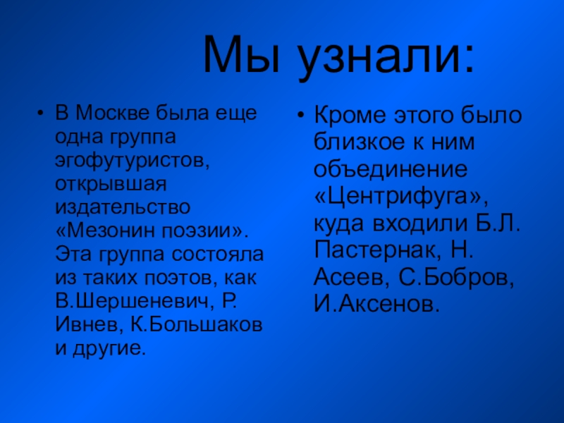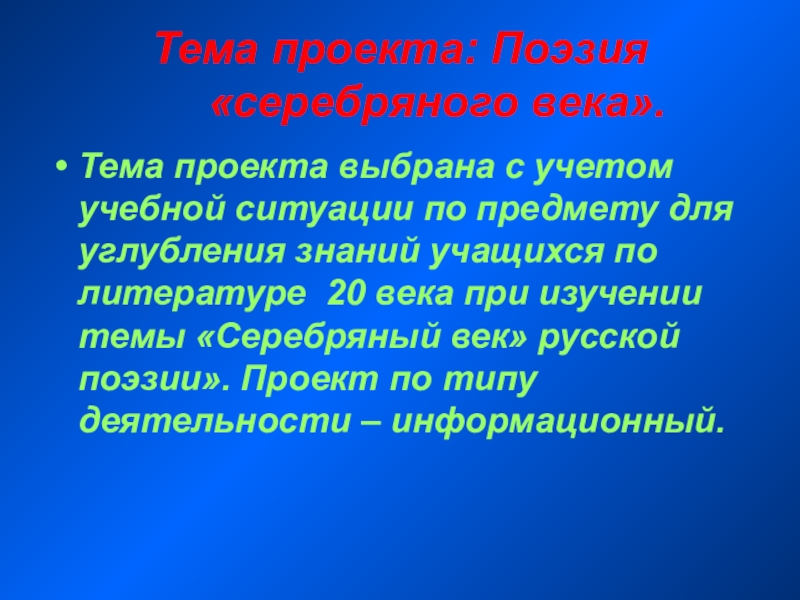 по предмету для углубления знаний учащихся по литературе 20 века при изучении темы «Серебряный век» русской поэзии». Проект по типу деятельности – информационный.