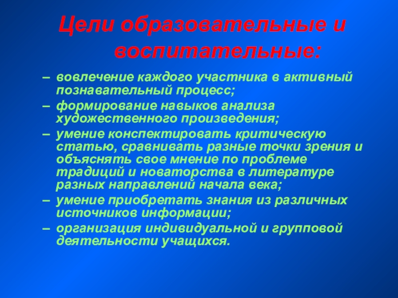 умение конспектировать критическую статью, сравнивать разные точки зрения и объяснять свое мнение по проблеме традиций и новаторства в литературе разных направлений начала века;
