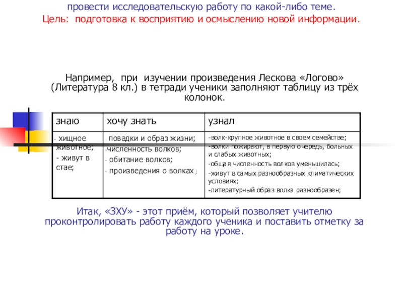 Итак, «ЗХУ» - этот приём, который позволяет учителю проконтролировать работу каждого ученика и поставить отметку за работу на уроке.