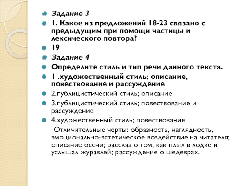 Отличительные черты: образность, наглядность, эмоционально-эстетическое воздействие на читателя; описание осени; рассказ о том, как плыл в лодке и услышал журавлей; рассуждение о шедеврах.