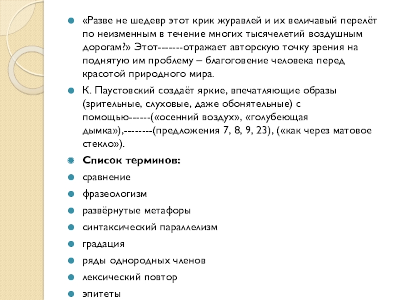 Слайд 10«Разве не шедевр этот крик журавлей и их величавый перелёт по
