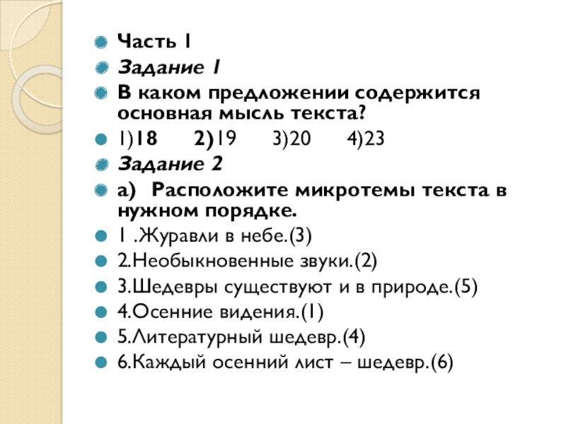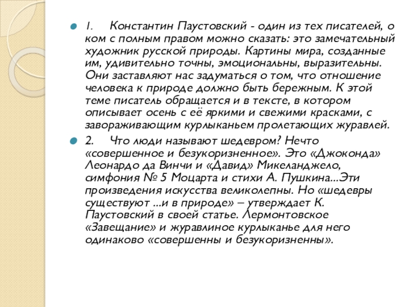 2. Что люди называют шедевром? Нечто «совершенное и безукоризненное». Это «Джоконда» Леонардо да Винчи и «Давид» Микеланджело, симфония № 5 Моцарта и стихи А. Пушкина...Эти произведения искусства великолепны. Но «шедевры существуют ...и в природе» – утверждает К. Паустовский в своей статье. Лермонтовское «Завещание» и журавлиное курлыканье для него одинаково «совершенны и безукоризненны».