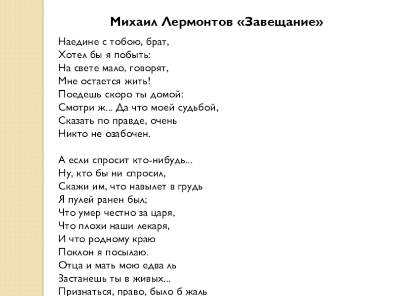 (15)3а несколько дней до этой встречи с журавлями один московский журнал попросил меня написать статью о том, что такое «шедевр», и рассказать о каком-нибудь литературном шедевре. (16) Иначе говоря, о совершенном и безукоризненном произведении. (17)Я выбрал стихи Лермонтова «Завещание».