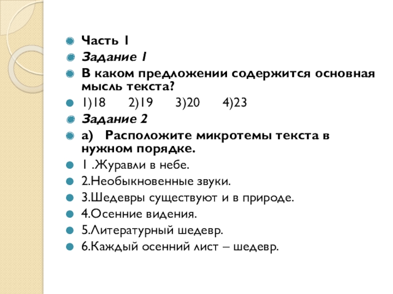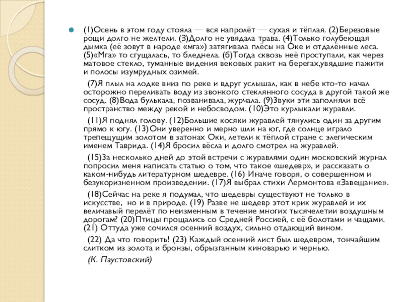 (18)Сейчас на реке я подумал, что шедевры существуют не только в искусстве, но и в природе. (19) Разве не шедевр этот крик журавлей и их величавый перелёт по неизменным в течение многих тысячелетии воздушным дорогам? (20)Птицы прощались со Средней Россией, с её болотами и чащами. (21) Оттуда уже сочился осенний воздух, сильно отдающий вином.