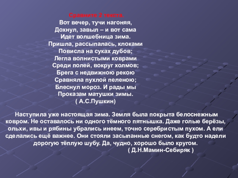 Наступила уже настоящая зима. Земля была покрыта белоснежным ковром. Не оставалось ни одного тёмного пятнышка. Даже голые берёзы, ольхи, ивы и рябины убрались инеем, точно серебристым пухом. А ели сделались ещё важнее. Они стояли засыпанные снегом, как будто надели дорогую тёплую шубу. Да, чудно, хорошо было кругом.