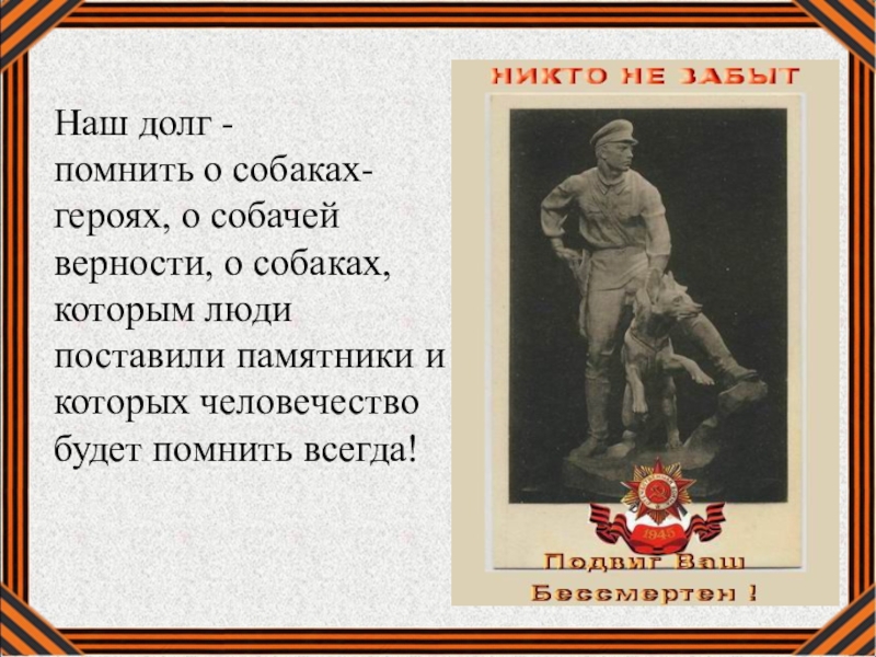 Слайд 26Наш долг -помнить о собаках-героях, о собачей верности, о собаках, которым люди поставили