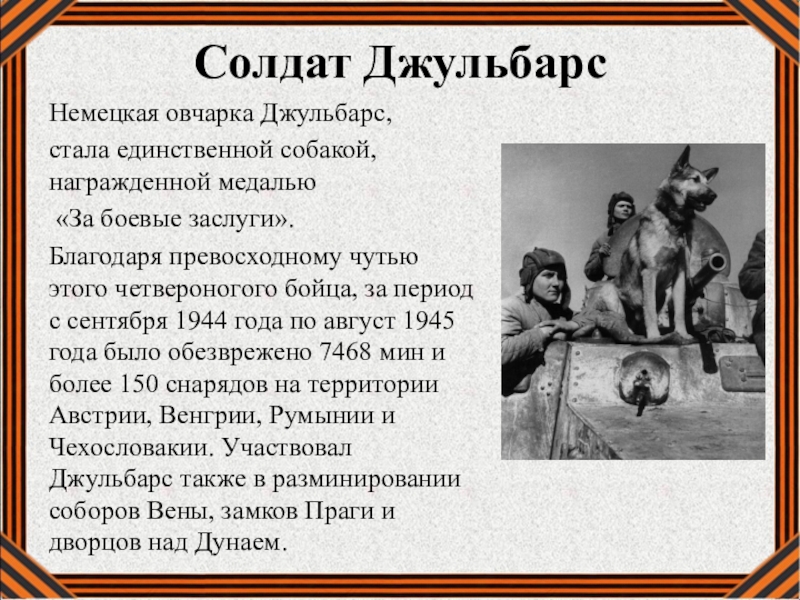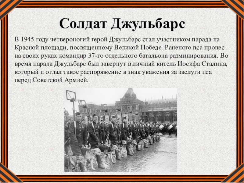 Слайд 18В 1945 году четвероногий герой Джульбарс стал участником парада на Красной