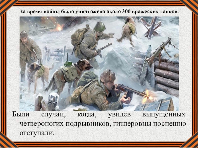 когда, увидев выпущенных четвероногих подрывников, гитлеровцы поспешно отступали.