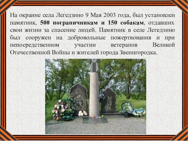 Слайд 24На окраине села Легедзино 9 Мая 2003 года, был установлен памятник,