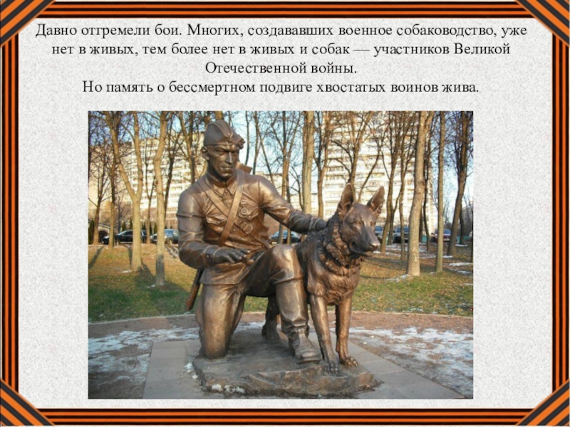 Слайд 21Давно отгремели бои. Многих, создававших военное собаководство, уже нет в живых,