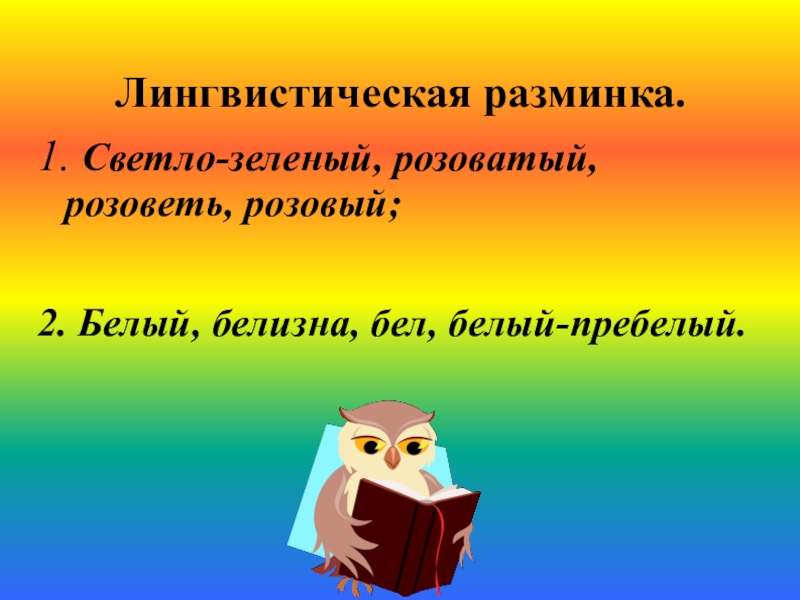 Лингвистическая разминка.1. Светло-зеленый, розоватый, розоветь, розовый;2. Белый, белизна, бел, белый-пребелый.