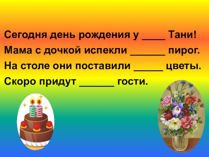 Сегодня день рождения у ____ Тани!Мама с дочкой испекли ______ пирог.На столе они поставили _____ цветы.Скоро придут