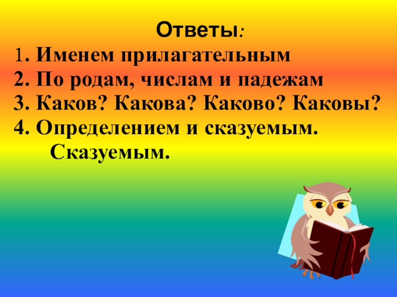 Ответы:1. Именем прилагательным2. По родам, числам и падежам3. Каков? Какова? Каково? Каковы?4. Определением и сказуемым. Сказуемым.