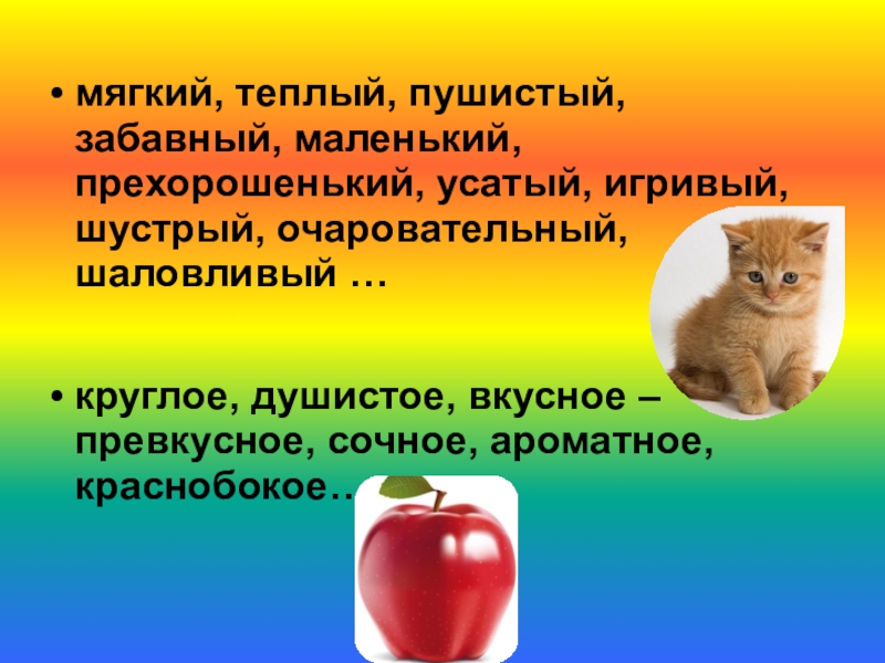 мягкий, теплый, пушистый, забавный, маленький, прехорошенький, усатый, игривый, шустрый, очаровательный, шаловливый … круглое, душистое, вкусное – превкусное, сочное, ароматное, краснобокое…
